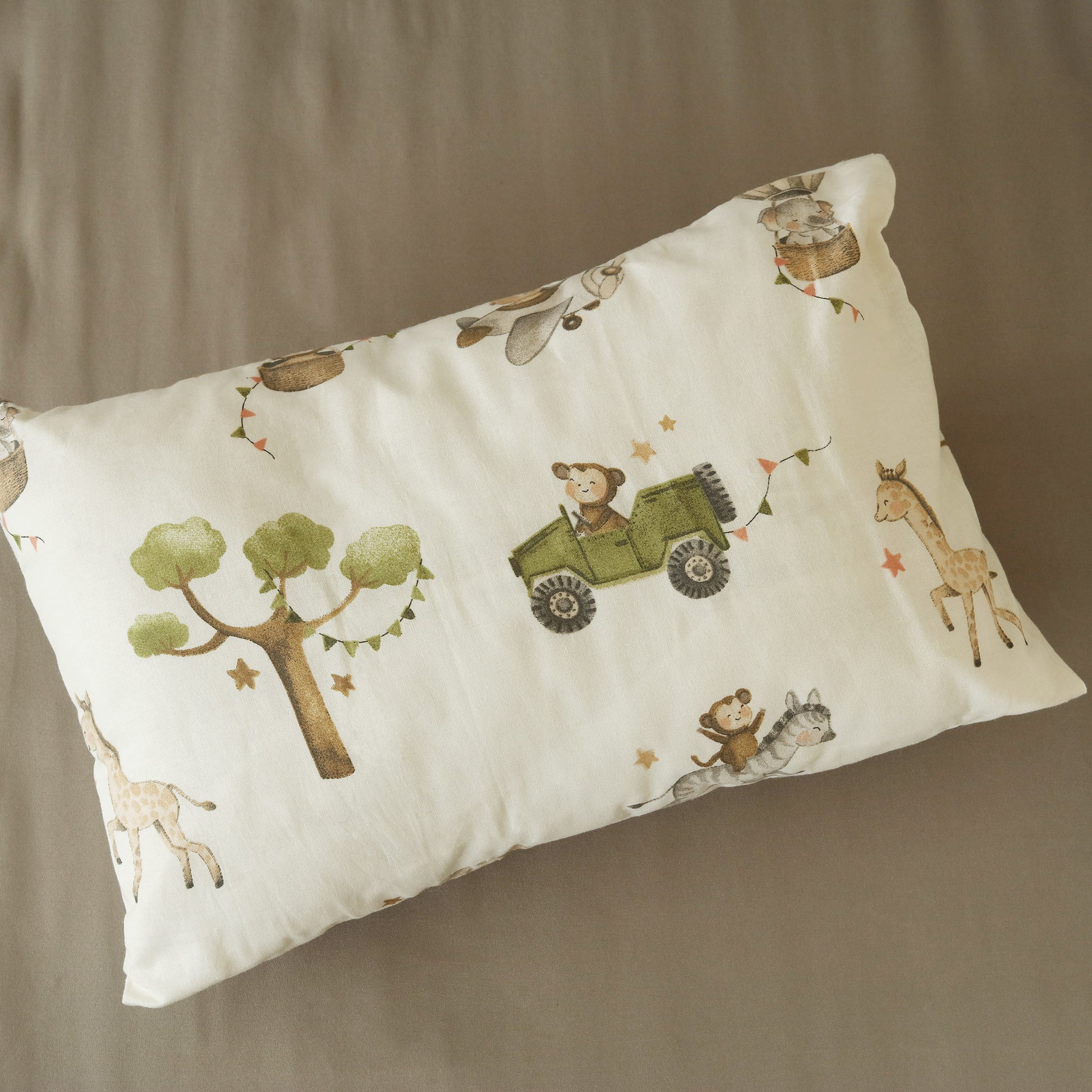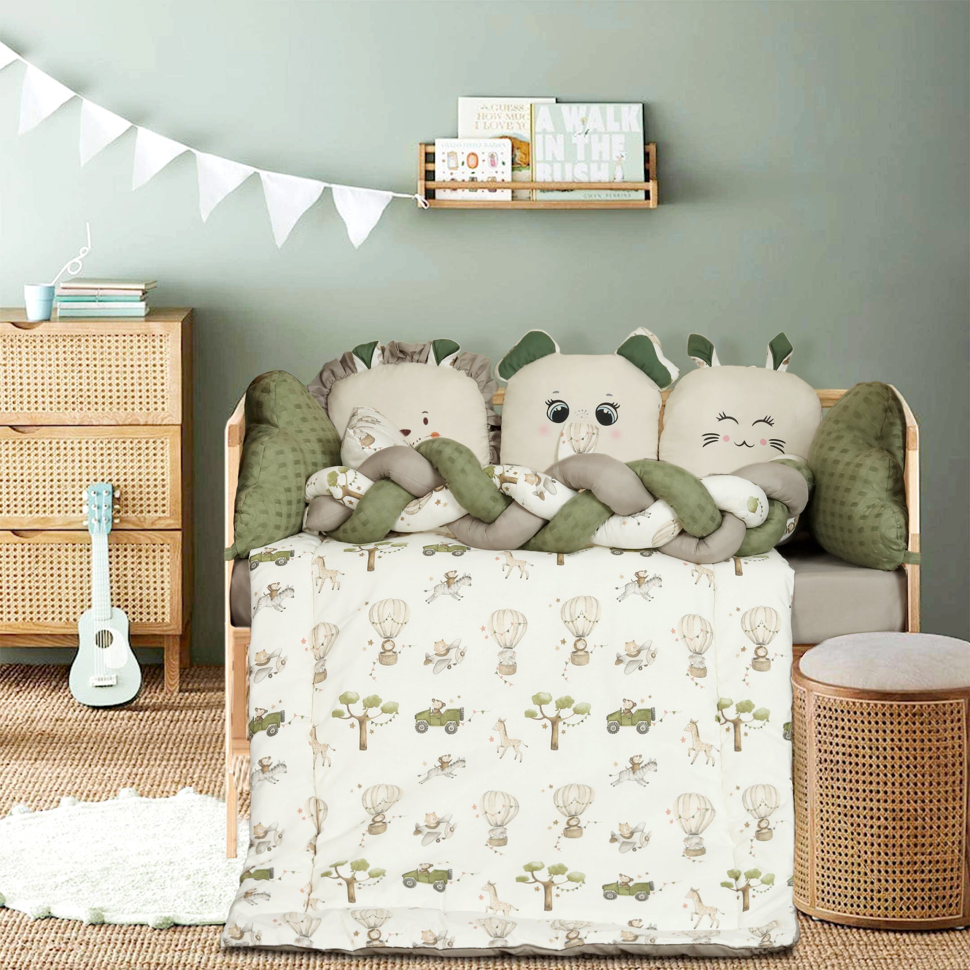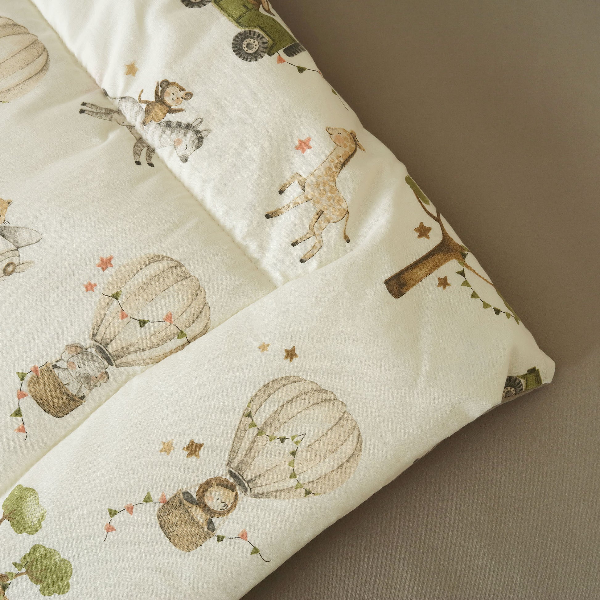 This delightful set features playful scenes of a cheerful elephant soaring high in a hot air balloon and a mischievous monkey cruising in a tiny car, creating a joyful world full of imagination and colour. Crafted from premium quality, ultra soft cotton, the set ensures gentle comfort for your baby’s delicate skin. The lightweight comforter provides just the right warmth, while the fun, storybook style prints turn bedtime into a dreamy adventure.
