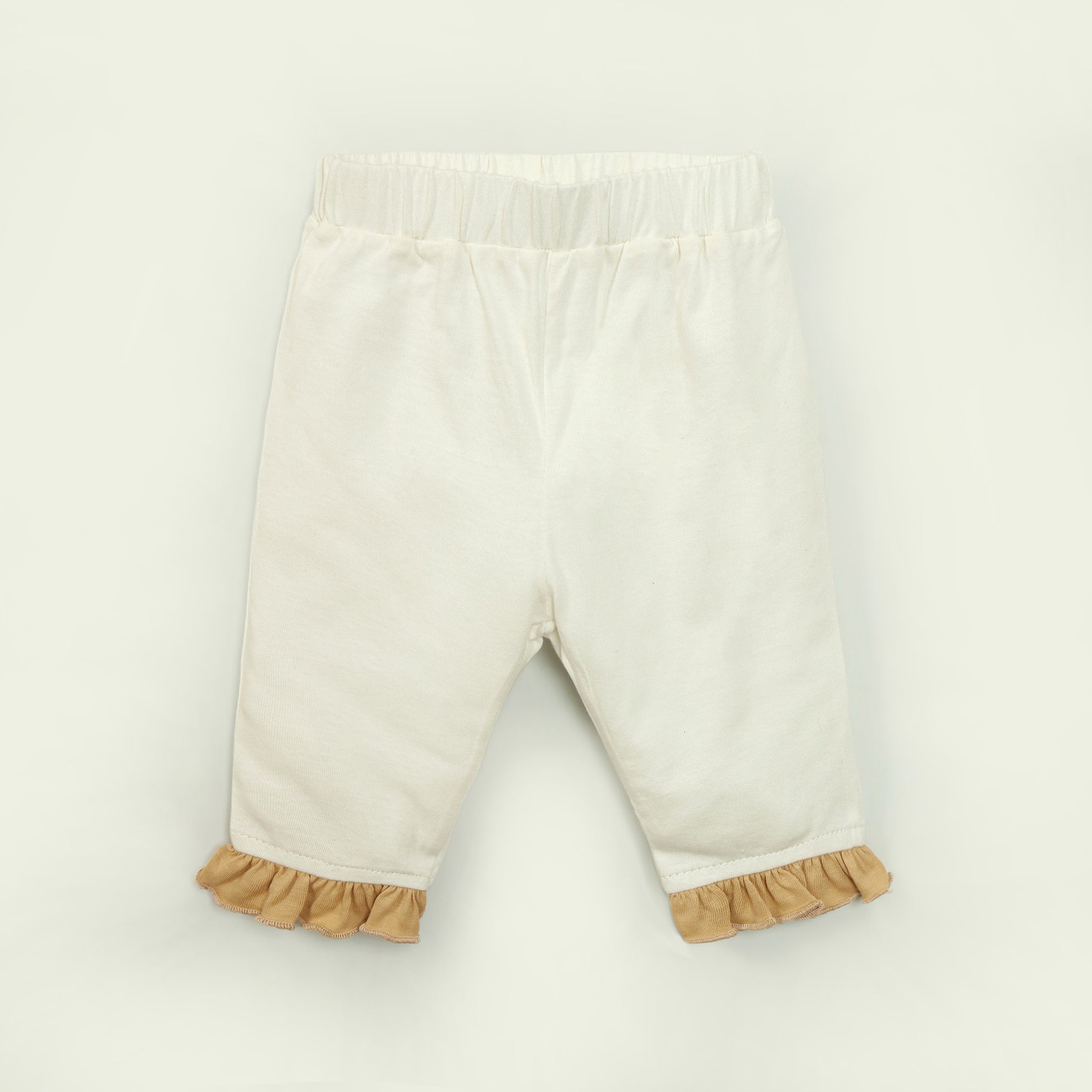 An elegant two-piece outfit in soft cream with golden accents, featuring a button-down top embroidered with delicate cherries and ruffled hem pants. Crafted from breathable cotton for a cozy yet refined look. Perfect for your little one’s charming everyday style.