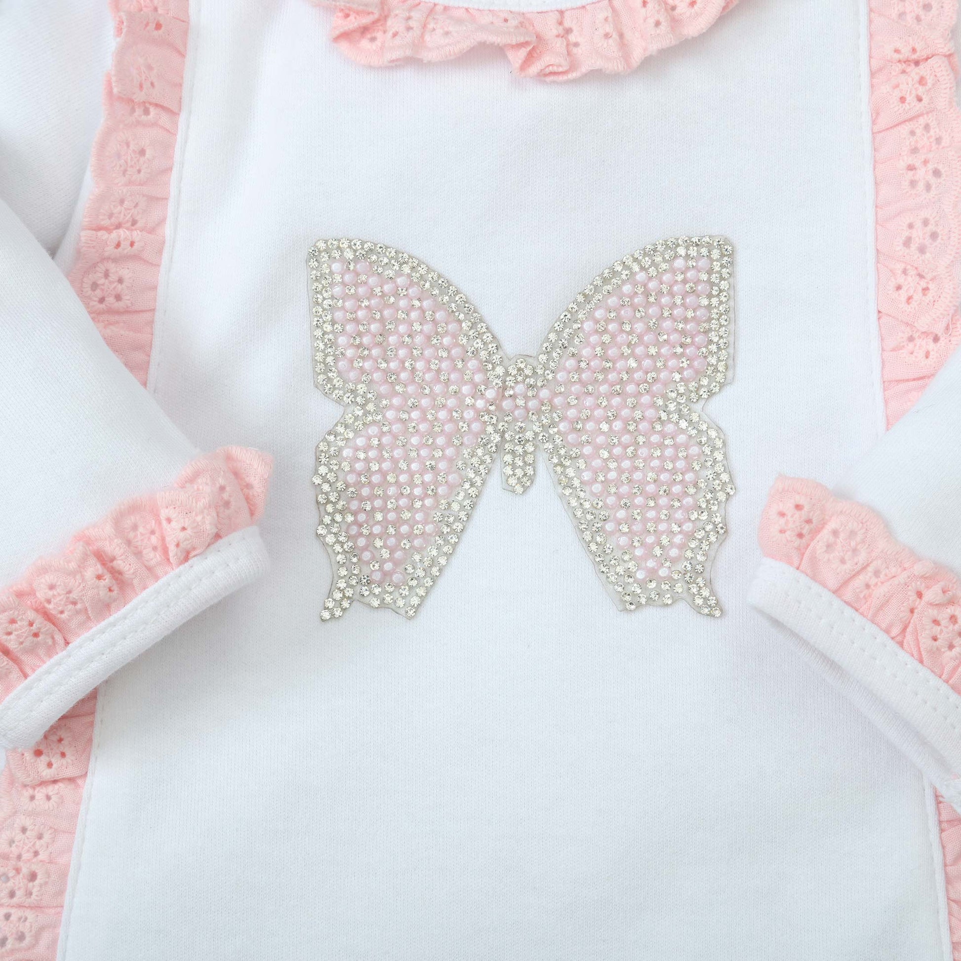 This adorable baby bundle features a soft white romper with pink lace trim and an elegant butterfly embellishment. The set includes a matching cap with a pink border, a cozy pair of mittens, and a wrapping sheet adorned with coordinating butterfly embroidery and lace trim. Perfect for adding charm and comfort to your newborn’s essentials.