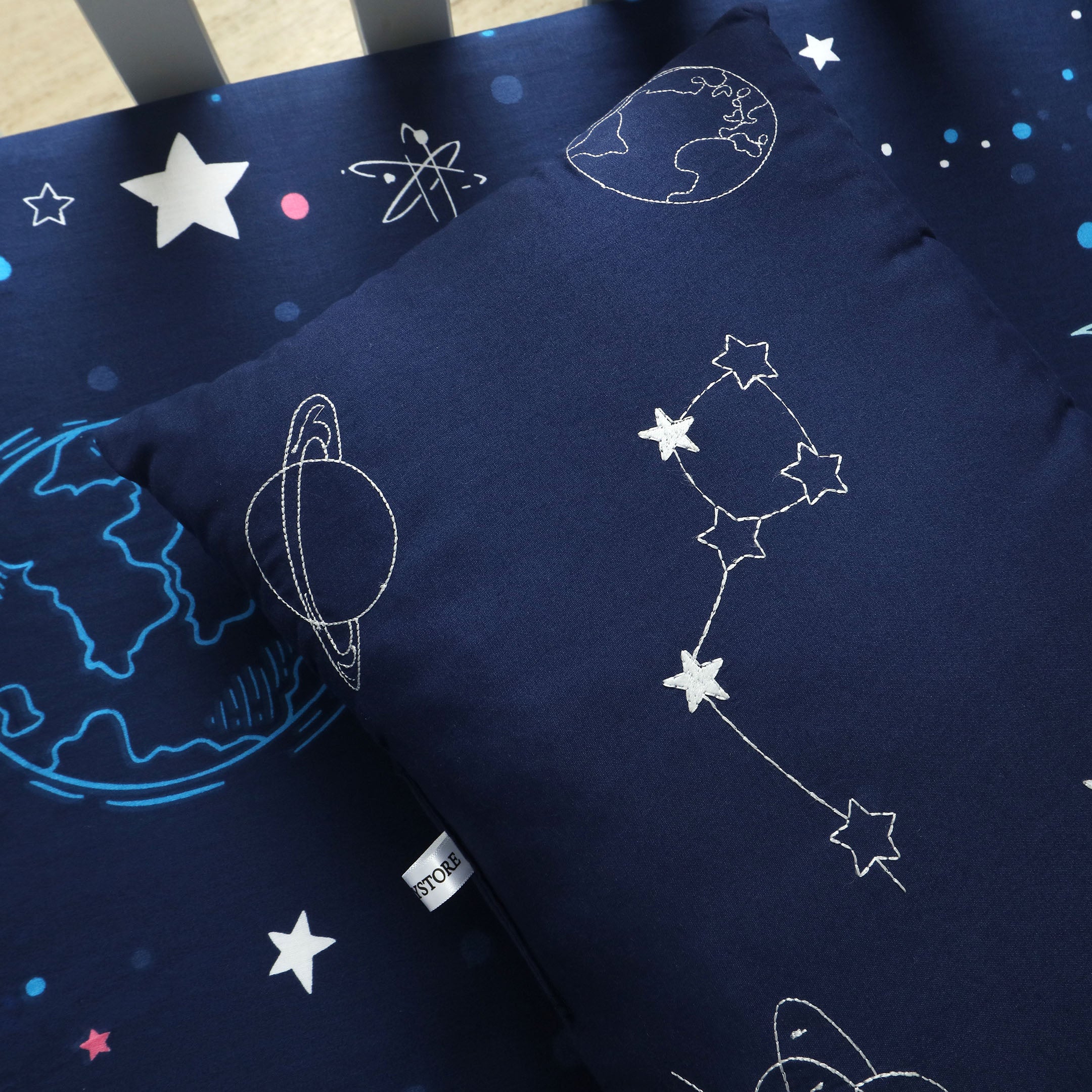 Decorated with twinkling stars, planets, and rockets, this bedding set sparks imagination and wonder in your little dreamer’s nursery. Made from soft, breathable, and skin-friendly fabric, it provides ultimate comfort for peaceful nights under a “starry sky.” The playful cosmic print add with embroidered pillow a modern, adventurous charm that’s perfect for both boys and girls. Create a dreamy, galaxy-inspired nursery where every nap feels like a journey through space.