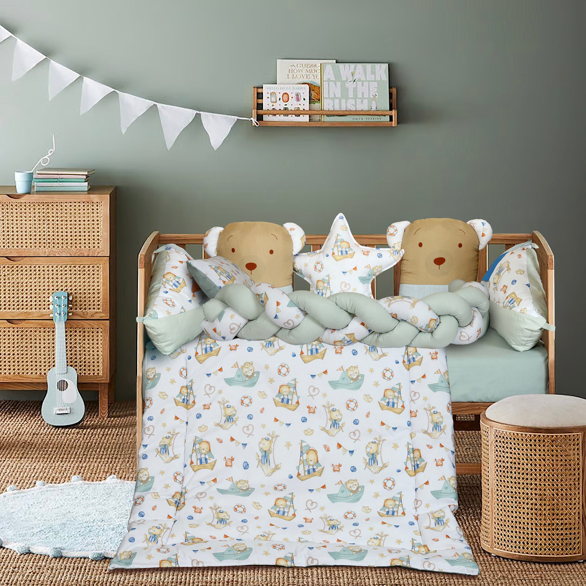 Designed for little adventurers who love soft snuggles and sea breeze dreams. Featuring an adorable bear sailing print with nautical details, this bedding set adds a charming, ocean inspired touch to your baby’s nursery. Crafted from ultra-soft, breathable cotton, it ensures gentle comfort through every nap and night. The plush comforter, matching fitted sheet, and decorative cushion create a complete and coordinated look perfect for cozy sleep and playful decor.