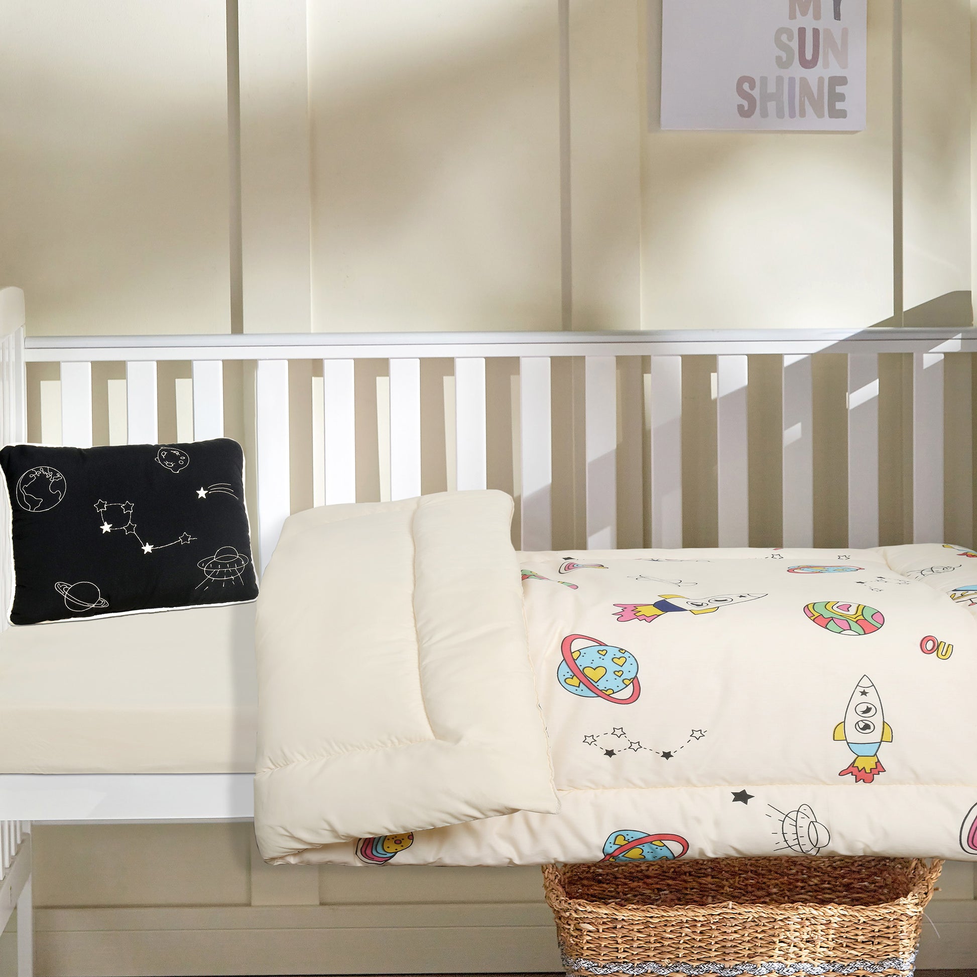 Blast off into dreamland with our adorable space-themed Little Astronaut Baby Comforter Set! Featuring little rockets, colorful planets, and charming starry details. Made from ultra-soft, breathable fabric, this set contains a cozy comforter, an embroidered pillow, and a matching printed bedsheet—ensures a snug and restful sleep for your little one. Crafted with premium-quality materials, it's gentle on delicate skin and built for long-lasting comfort.