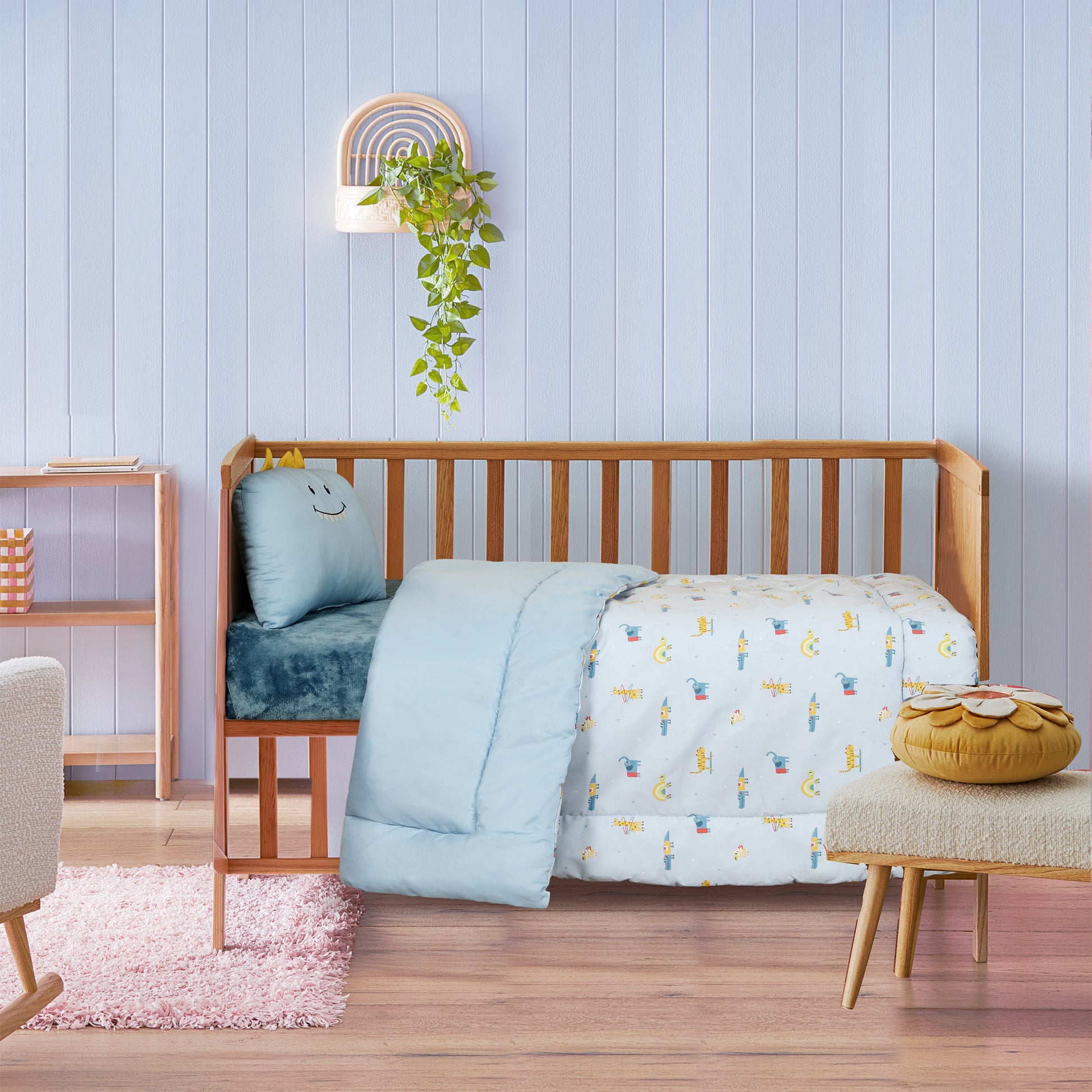 Drift into a world of fun and comfort with our Dino Dreams Comforter Set, Featuring playful dinosaurs and rainbows on a soft sky-blue base, this cozy set adds warmth and cheer to your little one’s bed. Made with gentle, breathable fabric, it’s perfect for cuddly naps and adventurous dreams. The plush filling keeps your little one snug through naps and nights, while the cute dinosaurs face cushion completes the set with a playful, heartwarming touch.