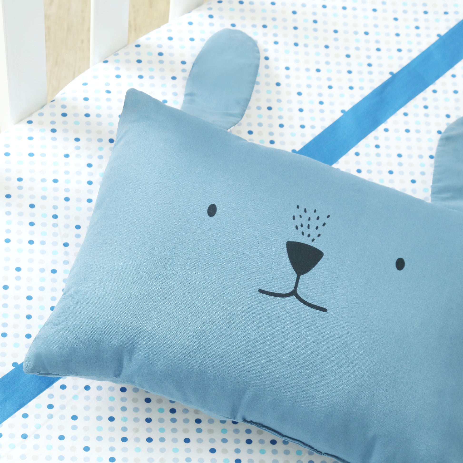 Our little one's nursery is coming together nicely! The crib is all set with an adorable sheet featuring blue polka dots and a blue stripe, paired with a cute blue pillow shaped like a bear's face. The white crib slats provide a clean and crisp backdrop for the colorful bedding. A glimpse of a colorful throw pillow on the floor adds a pop of color to the room. It's moments like these that make us cherish the journey of parenthood.