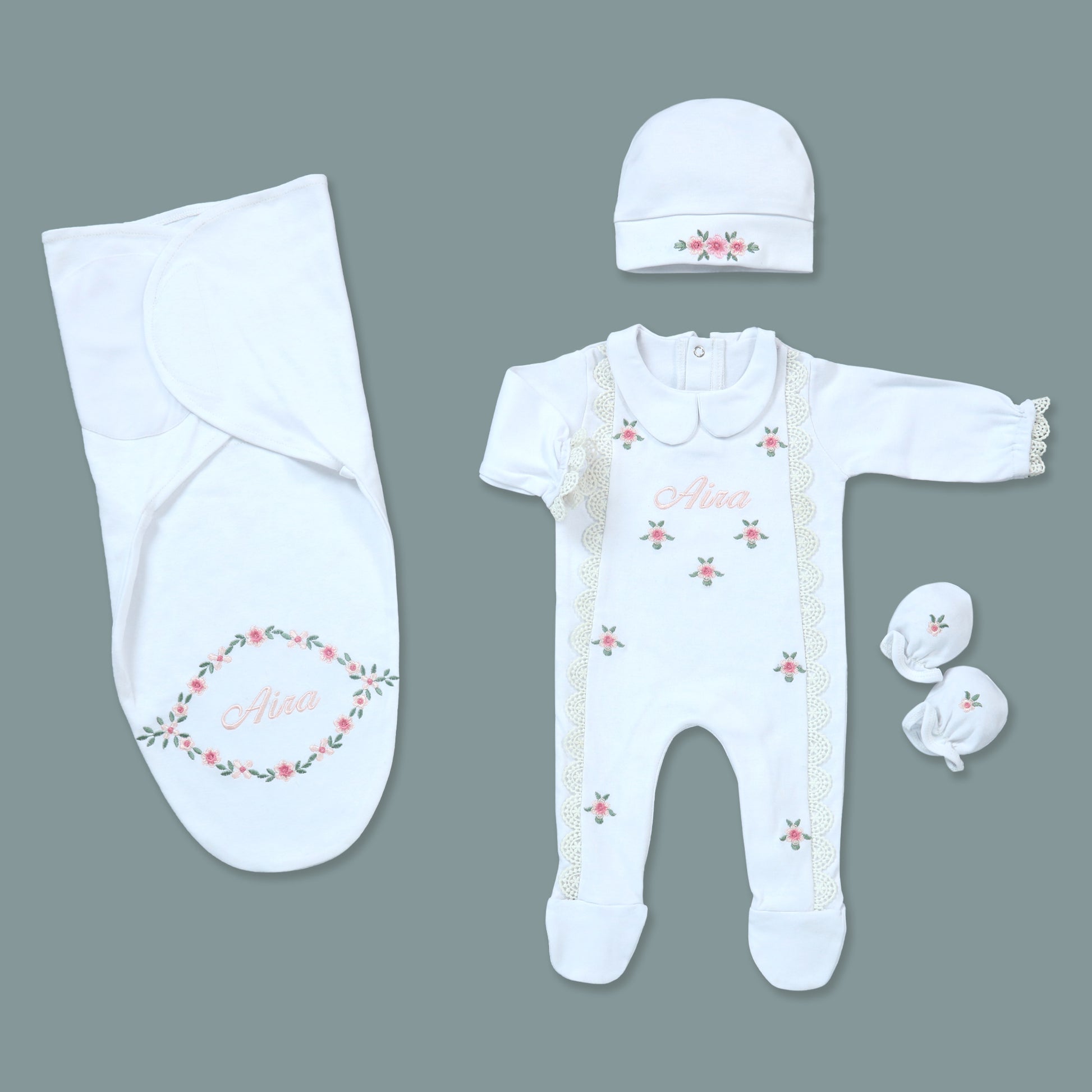 This charming bundle includes a white onesie decorated with dainty floral embroidery with customized name enhanced by lace detailing on the front. The set comes with a coordinating floral-embroidered baby cap, mittens, and a swaddle wrap featuring an intricate floral wreath. Ideal for gifting or special moments with your baby.