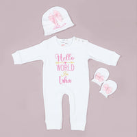 - Custom Embroidery: The romper is adorned with the sweet message "Hello World, I am [Your Baby's Name]," creating a personalized touch.