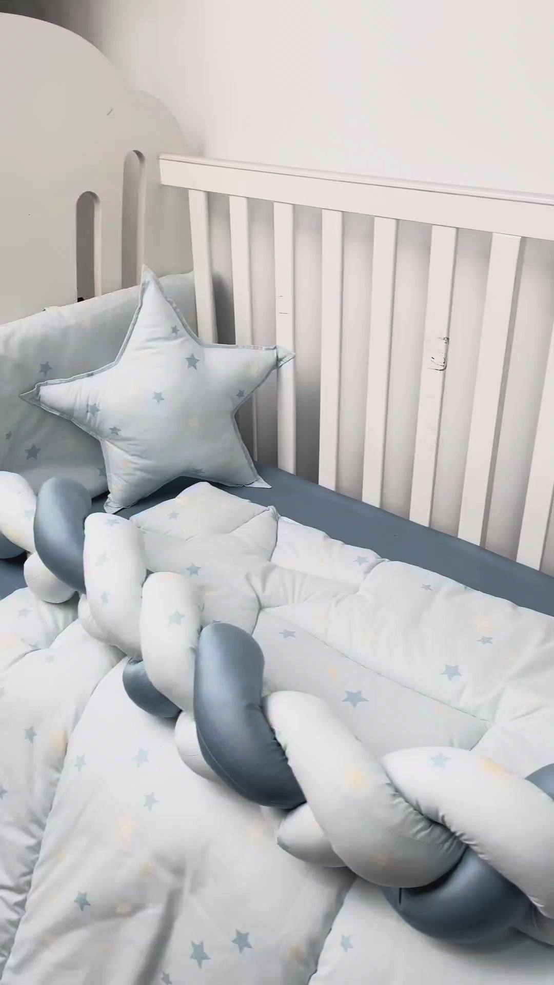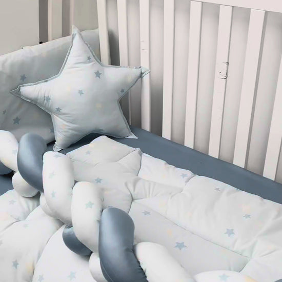 This bedding set features cute star prints that add a fun and playful touch to your baby boy’s room. Made from soft cotton fabric, it feels gentle and comfortable on delicate skin. The lightweight quilt keeps your little one cozy, while the matching sheets and cushions complete the look. Perfect for everyday use, this set creates a calm, cozy, and happy sleep space.