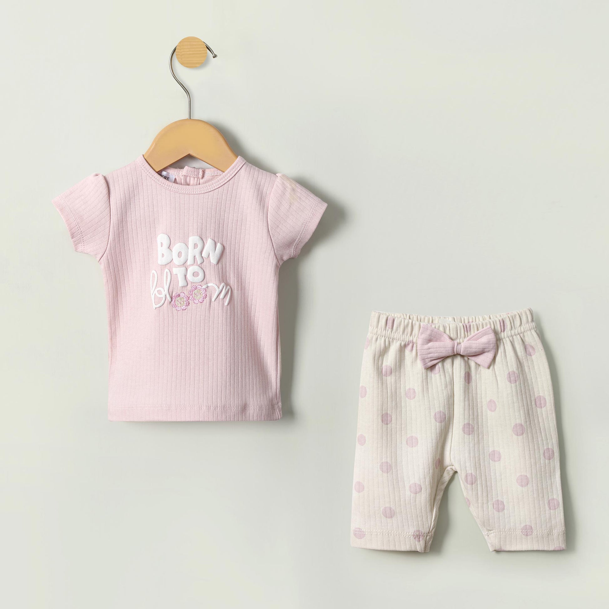 Let your little one bloom in style with this adorable baby girl’s outfit set. The soft pink ribbed t-shirt features puffed sleeves and a delightful textured slogan on the front that reads: "Born to Bloom", with embroidered and fluffy 3D details for added charm.