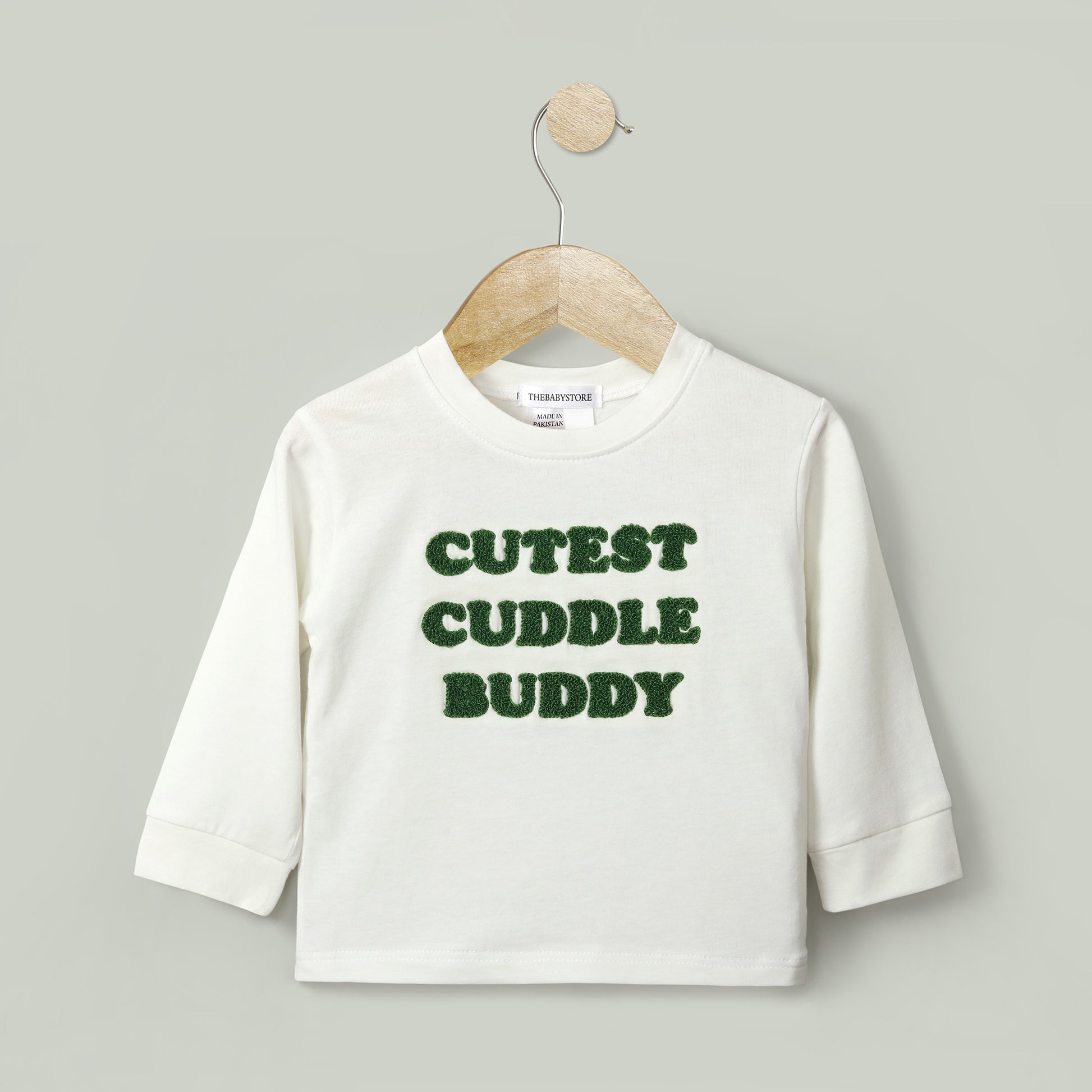 A charming two-piece outfit featuring a cutest,cuddle,buddy embroidery, paired with comfy pants. Made from soft, breathable cotton for all-day comfort. Perfect for your little playful adventures and outdoor fun.
