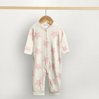 Our star-print baby romper, designed for ultimate comfort and style. Made from soft, breathable interlock, these cozy onesies are perfect for keeping your baby snug and happy all day long. Featuring cute pastel star patterns in pink and gray, they come with easy snap buttons for quick changes. This adorable baby romper features a puff print design, adding a fun and textured look to the outfit. The raised, soft star-shaped puff print on the back enhances both style and comfort. Made using high-quality heat activated ink, the puff print creates a three-dimensional effect.