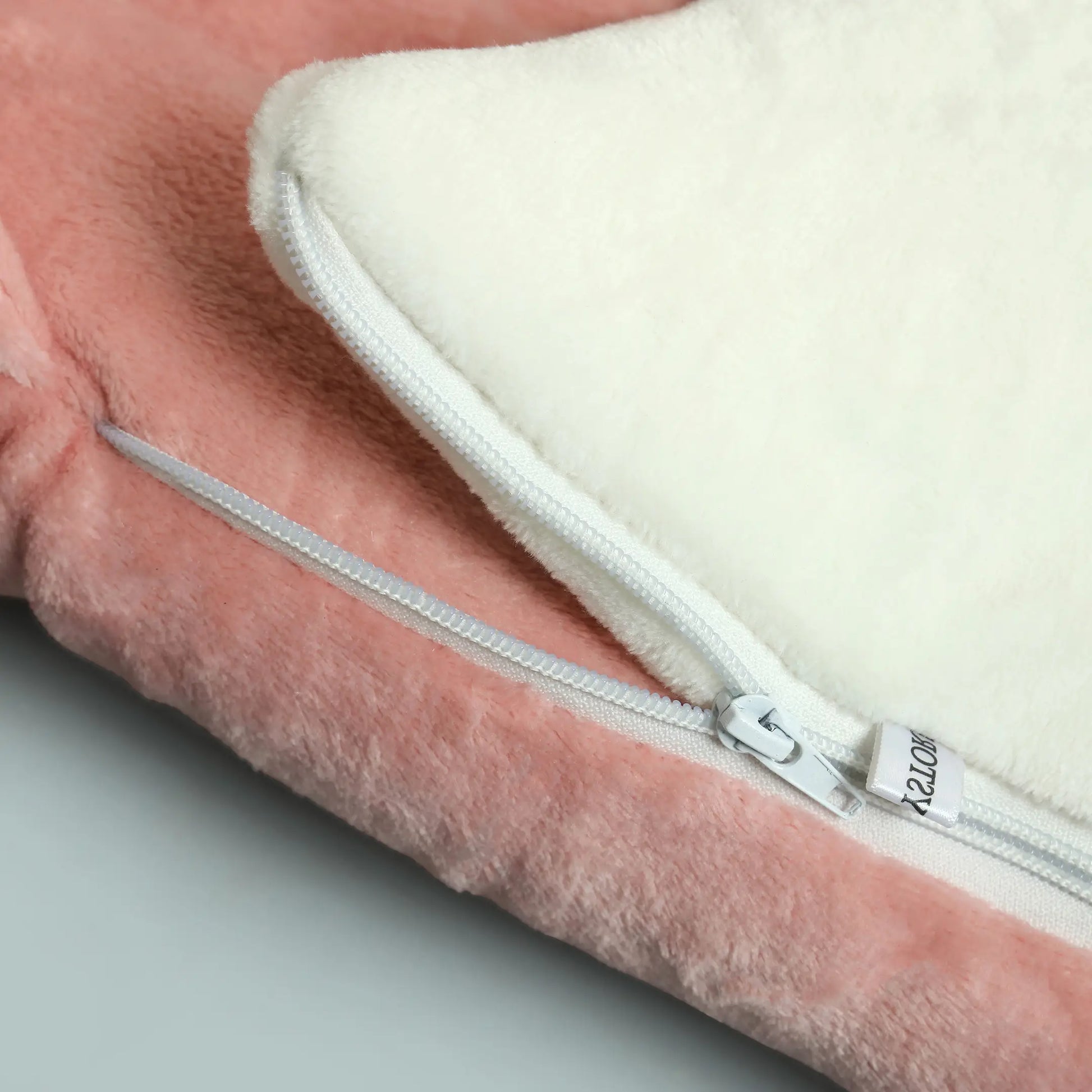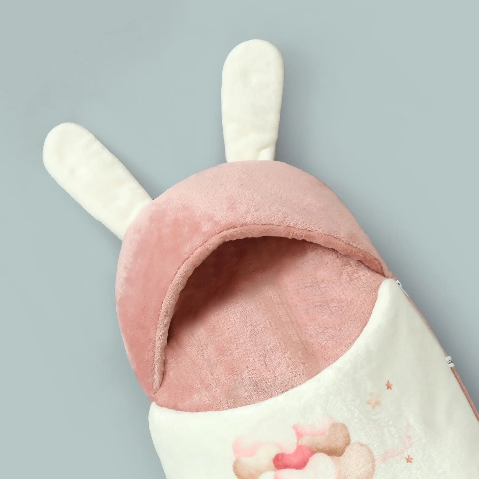 This cozy fleece carry nest is designed to wrap your little one in warmth and comfort. Featuring a soft blush-pink interior with cute bunny ears on the hood, it gives a playful yet soothing look. The front showcases an adorable bunny holding pastel heart-shaped balloons with the words “Hello Baby”, making it perfect for newborn snuggles or gifting. Gentle on the skin and irresistibly cute, this carry nest is both practical and charming.