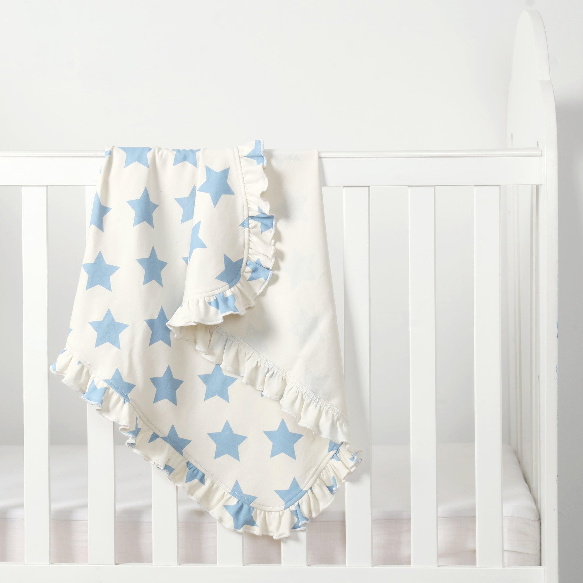 Wrap your little one in cozy comfort with our adorable baby wrapping sheet, featuring a charming sky-blue star print. Designed with a cute cap at the corner and delicate ruffled edges, this snuggly wrapping sheet keeps your baby warm. Made from high-quality, breathable fabric, it's perfect for gentle cuddles and a peaceful sleep.