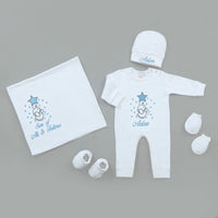 Embroidered Cap: A delicate white cap embroidered with your Baby name offers a sweet touch, ensuring your baby stays warm while looking adorable.