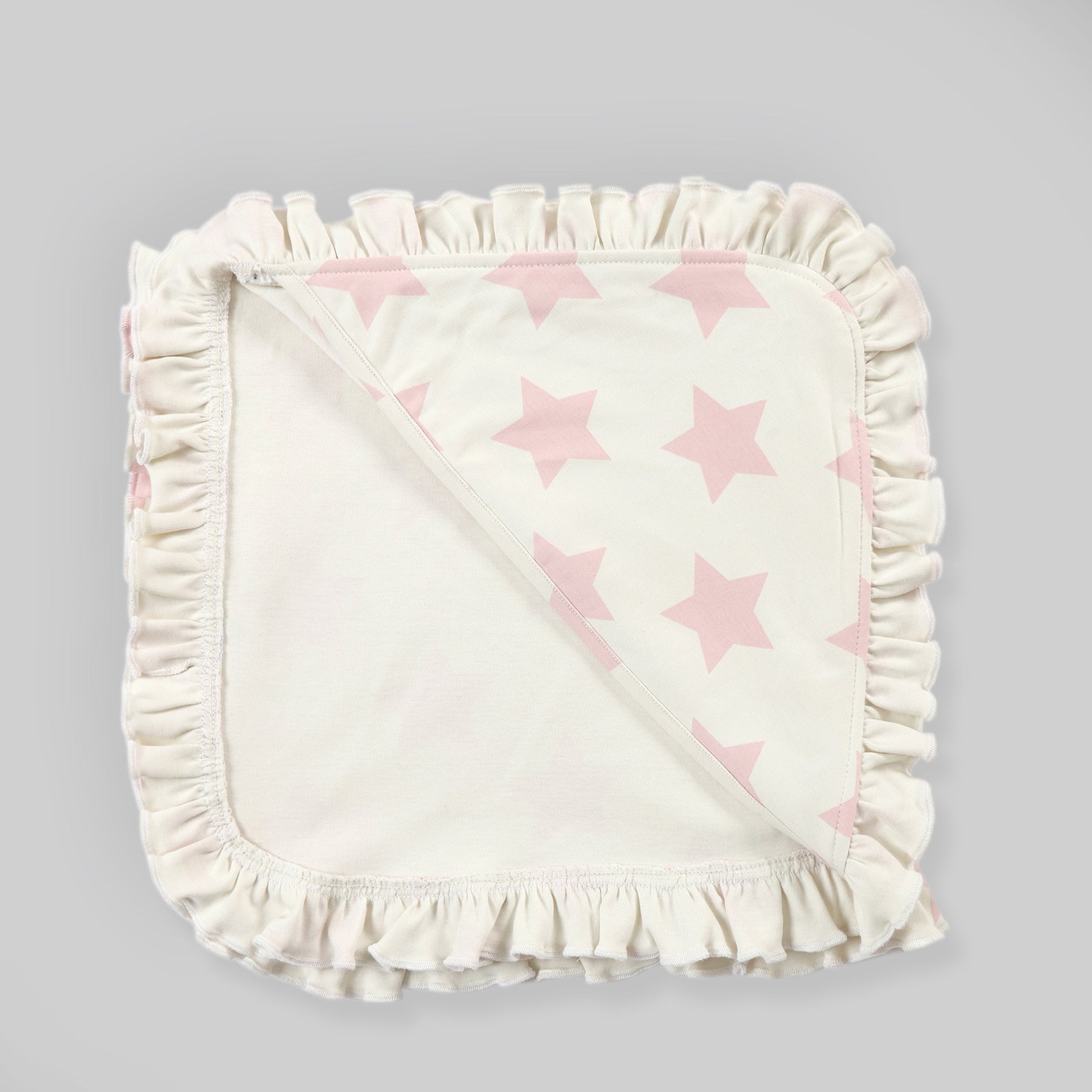 Wrap your little one in pure comfort with our adorable baby wrapping sheet, designed for warmth and style. Featuring a charming pink star print on a soft cream base, this sheet comes with a cozy cap at the corner and delicate ruffle detailing along the edges. Crafted from high-quality, breathable fabric, it ensures a gentle touch against your baby's delicate skin.