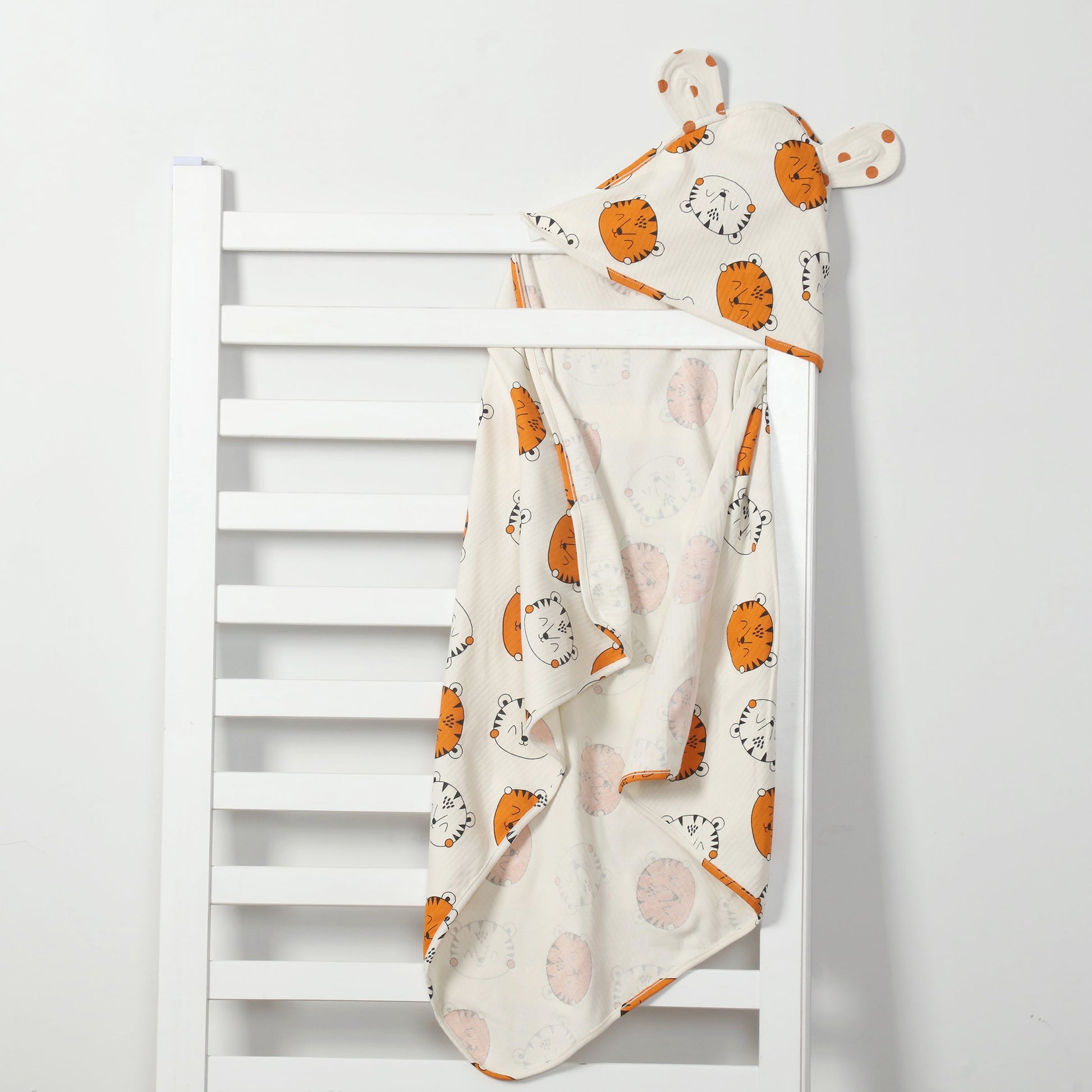 Wrap your little one in this adorable baby wrapping sheet designed for providing a cozy comfort. Made from high-quality, soft fabric, this wrapping sheet features a charming print of sleepy tiger faces in warm orange and soft white tones. The cute hooded corner comes with two playful ears, add a delightful touch to your baby's nap time.