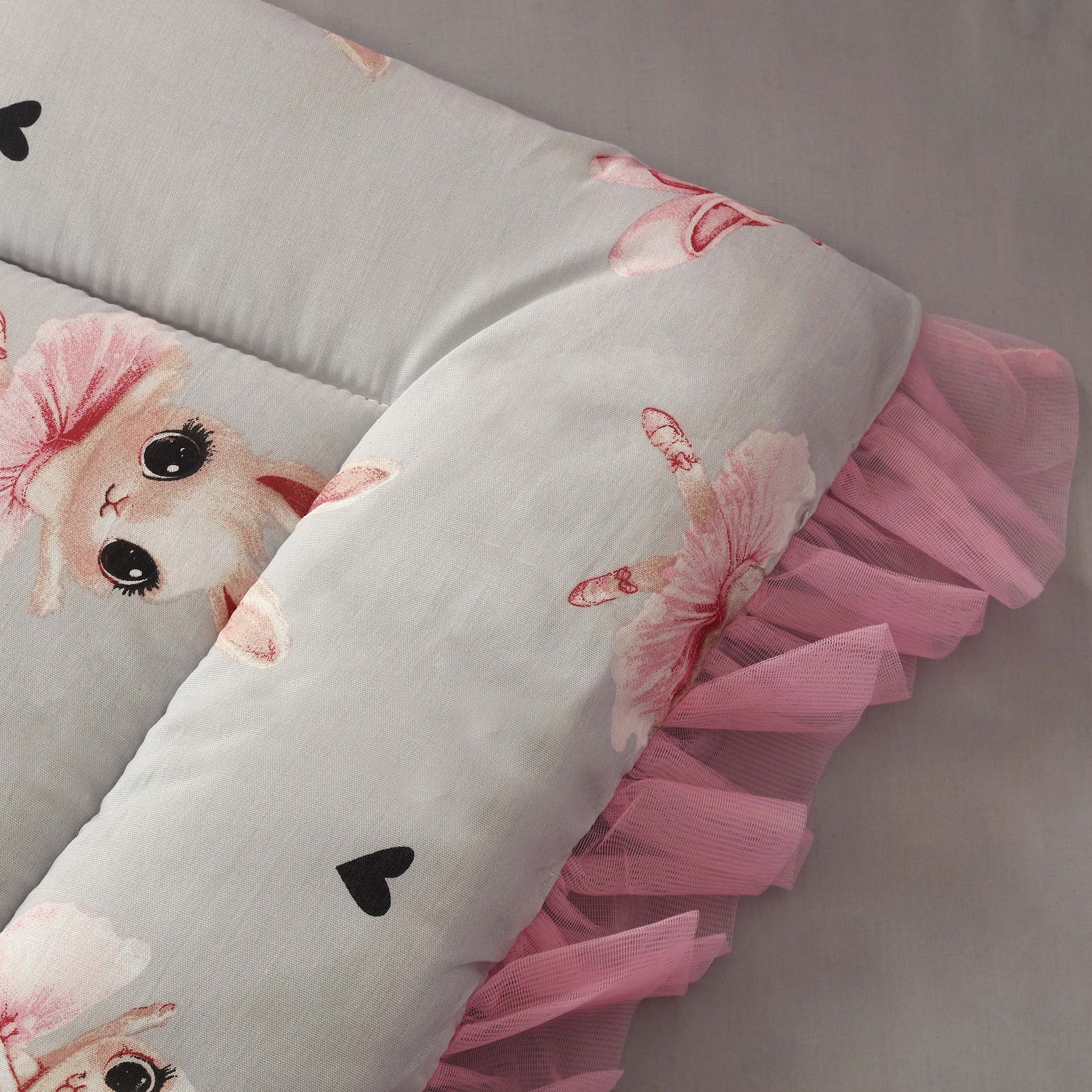 This lovely cot set features cute little bunnies dressed like ballerinas, with soft pink details and tiny hearts. Made from gentle cotton fabric, it feels soft and comfortable on your baby’s skin. The lightweight quilt keeps your little one cozy, while the matching cushions and side bumpers add extra comfort and a sweet look. Perfect for everyday use, this set creates a calm, cozy, and adorable sleep space for your baby.