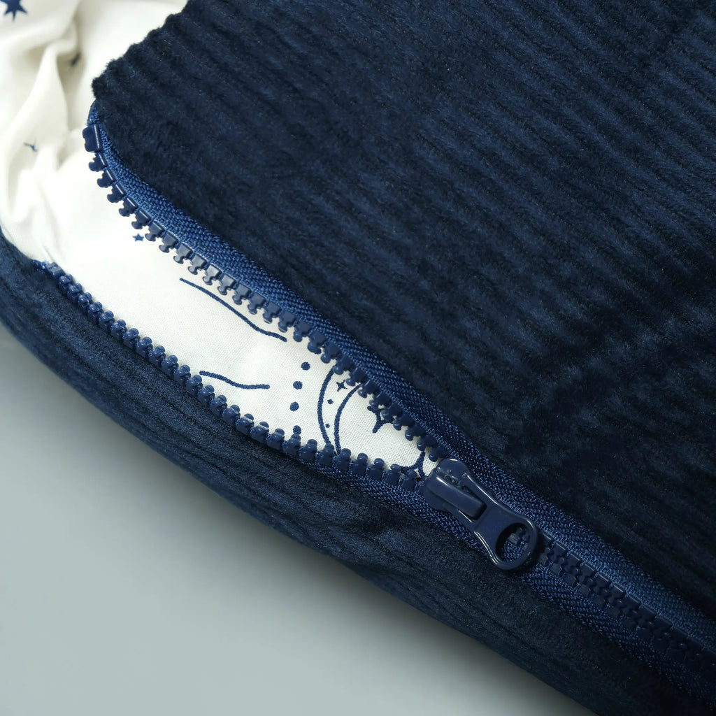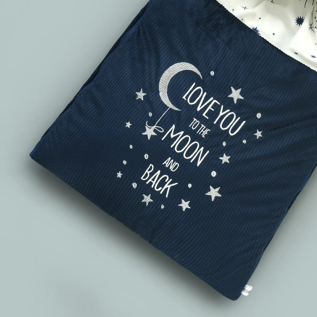 Cozy and soft navy blue baby sleeping bag with embroidered “Love You to the Moon and Back” design. Features star-printed lining, secure zipper closure, and gentle padding to keep your baby warm and comfortable. Perfect for everyday use or gifting.