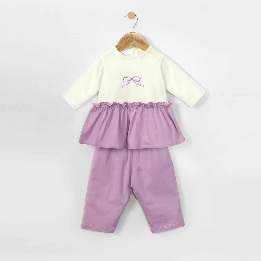 A soft and elegant two-piece baby outfit featuring a creamy top with a delicate lilac bow and ruffled peplum, paired with comfy lilac trousers. Made from gentle, breathable cotton for everyday comfort and style. Perfect for cozy play dates or dreamy naps.