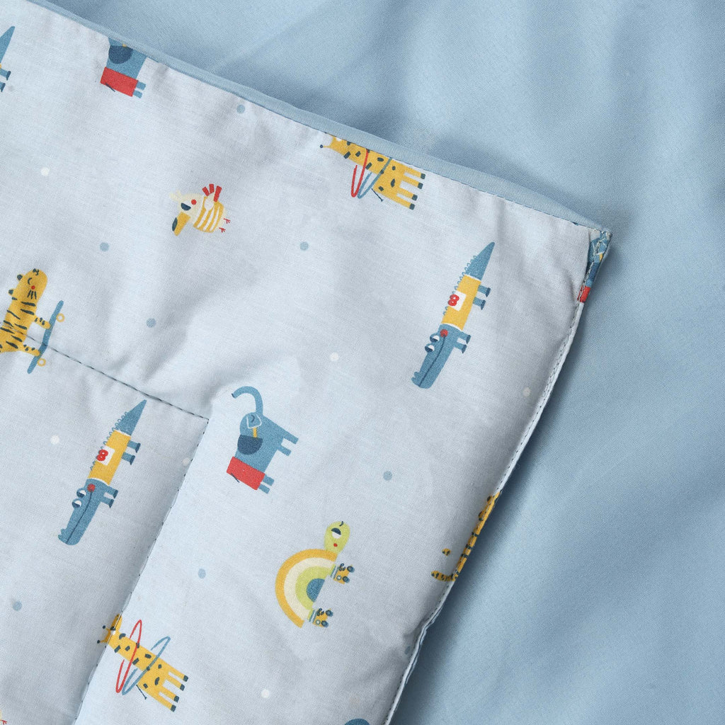 Drift into a world of fun and comfort with our Dino Dreams Comforter Set, Featuring playful dinosaurs and rainbows on a soft sky-blue base, this cozy set adds warmth and cheer to your little one’s bed. Made with gentle, breathable fabric, it’s perfect for cuddly naps and adventurous dreams. The plush filling keeps your little one snug through naps and nights, while the cute dinosaurs face cushion completes the set with a playful, heartwarming touch.